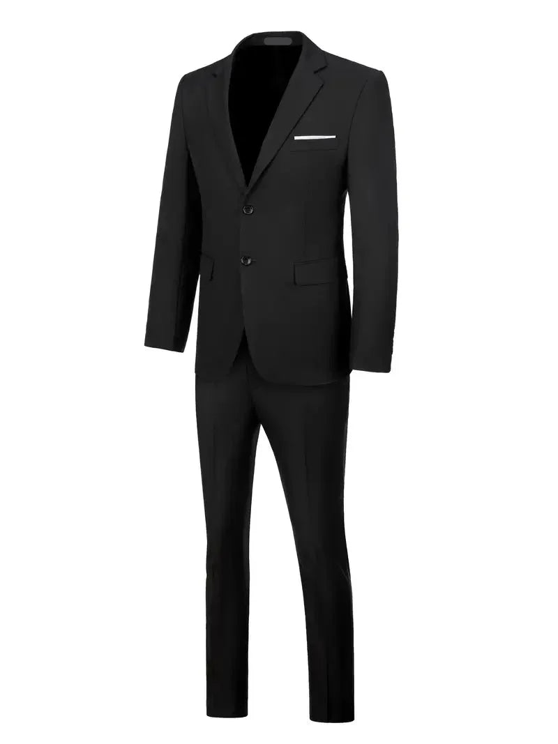 Este traje para hombre ha sido diseñado para ofrecer una silueta definida y actual. La chaqueta cuenta con dos botones delanteros, aportando un acabado clásico con un toque contemporáneo. Se presenta como una opción ideal para bodas, celebraciones y reuniones elegantes.